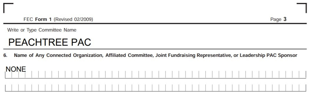 While the Senate Leadership Fund copped to its relationship with Peachtree PAC to the press, Peachtree PAC was less forthcoming with the FEC. In its Statement of Organization, Peachtree PAC is required to list an "connected organization" or "affiliated committee." Dozier, on behalf of Peachtree PAC, responded "NONE."