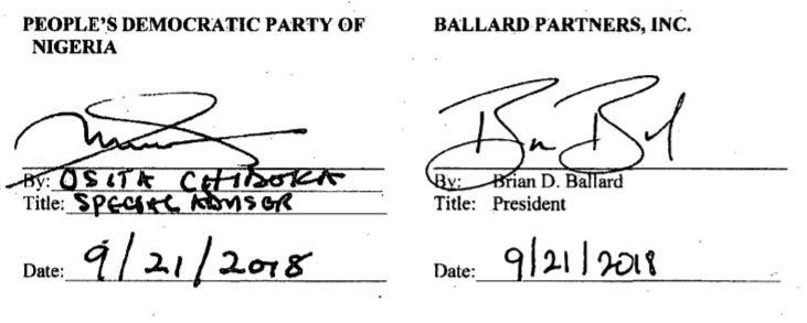 On September 21, 2018, Abubakar, through his political party, The People’s Democratic Party, inked a contract with Ballard Partners for $1.1 million per year. Among other things, Ballard was to help Abubakar advance "democratic values and the rule of law in Nigeria." The contract required an immediate payment of $270,000 with another $270,000 due in late December.
