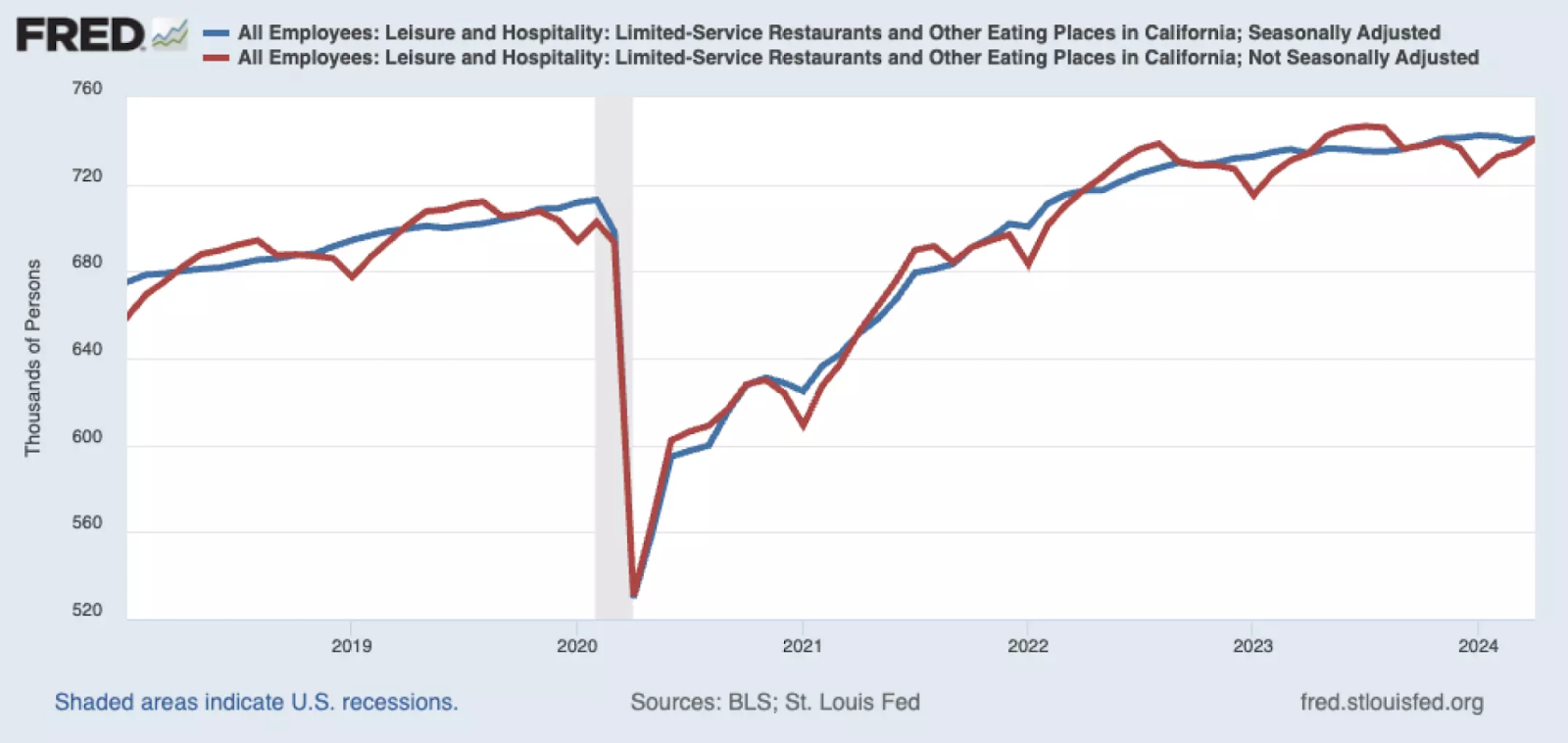 Every year, there is a modest decline in employment at fast food restaurants from November through January, “when many people travel for holidays like Thanksgiving or Christmas and spend time cooking and eating with family.” So, employment didn't decline between September and January because of the wage increase. It consistently declines during that period every year, which you can see reflected in the red line in the chart below. That's why the BLS offers seasonally adjusted data, represented by the blue line.