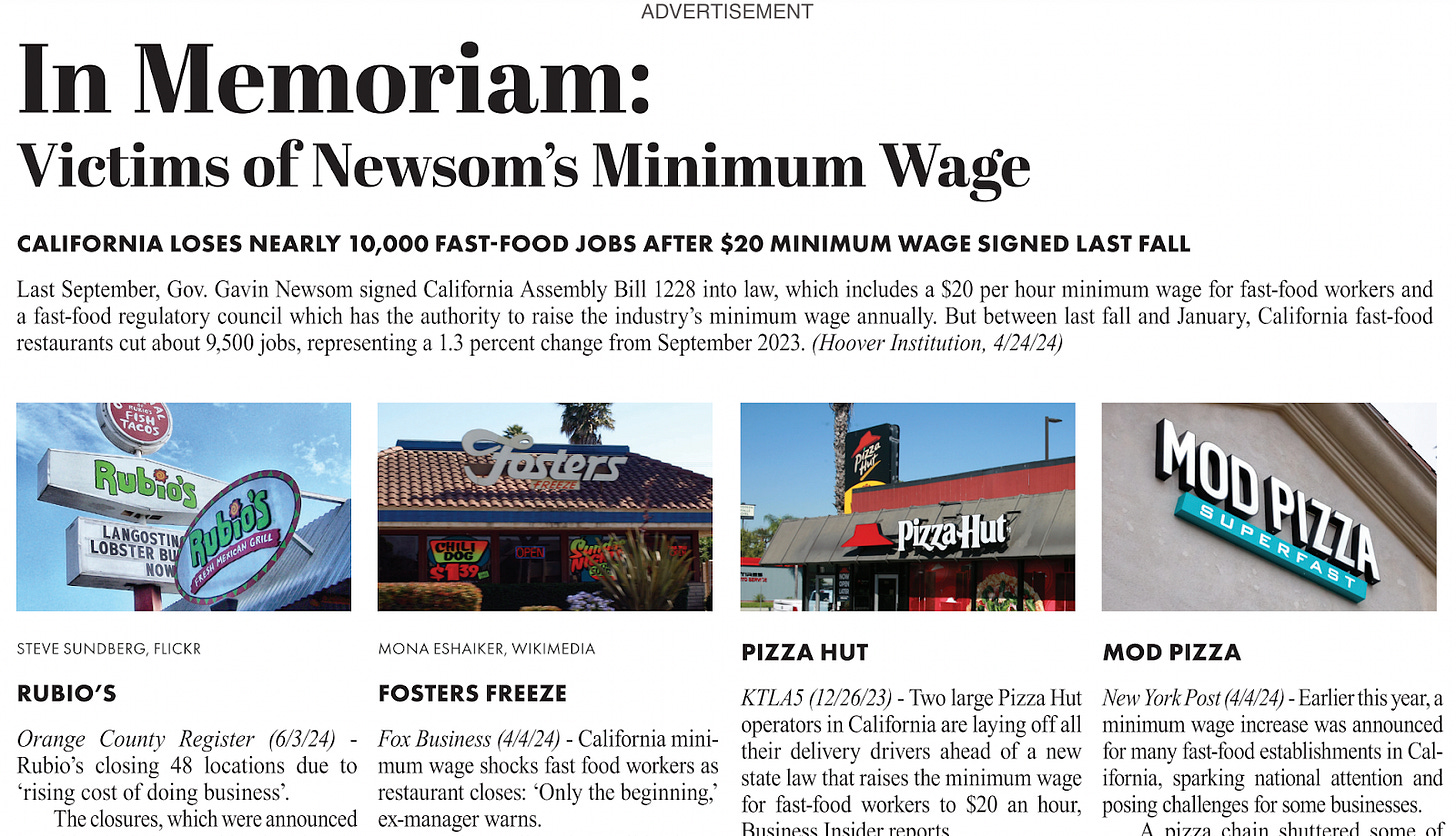 In June 2024, the California Business and Industrial Alliance, an industry lobbying group, ran a full-page ad in USA Today claiming that the fast food industry cut about 9,500 jobs as a result of the $20 minimum wage.