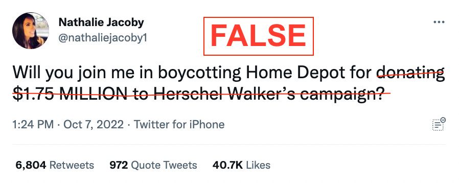 On Friday, Nathalie Jacoby tweeted that Home Depot had donated $1.75 million to the Georgia U.S. Senate campaign of Herschel Walker (R). Jacoby, a self-described "Democrat" who offers advice on how to grow Twitter accounts for $9.99 a month, was incorrect. Nevertheless, her tweet was the catalyst for calls to #boycotthomedepot to trend on Twitter.