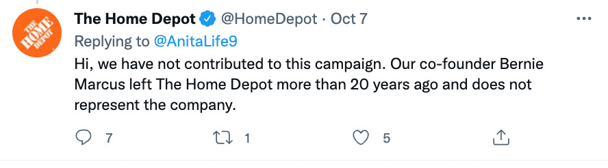 Home Depot was eager to distance itself from Walker. The company told TMZ that its PAC has not donated to Walker's campaign. The company has also sent over 70 tweets like this, suggesting that it was not supporting Walker.