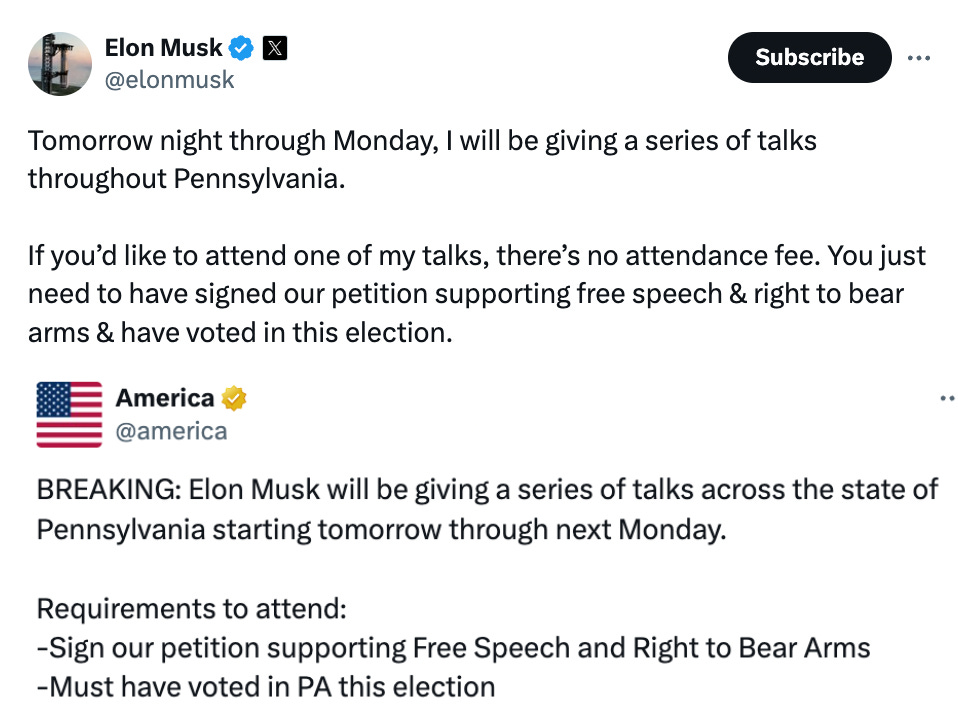 Musk, of course, has the right to hold an event explaining why he supports Trump. But these events, hosted by America PAC, a Super PAC founded by Musk, are not open to everyone. To attend, people must sign Musk's petition supporting free speech and the right to bear arms and have already voted in Pennsylvania.